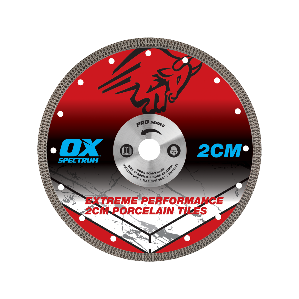 OX Pro 2CM Porcelain Cutting Blade – 230/25.4mm. Experience swift and precise cutting with its unique diamond segment. Stay cool under pressure with integrated cooling holes, ensuring stability even when tackling the toughest materials. Its mesh segment design minimizes chipping, ideal for both wet and dry cutting applications.