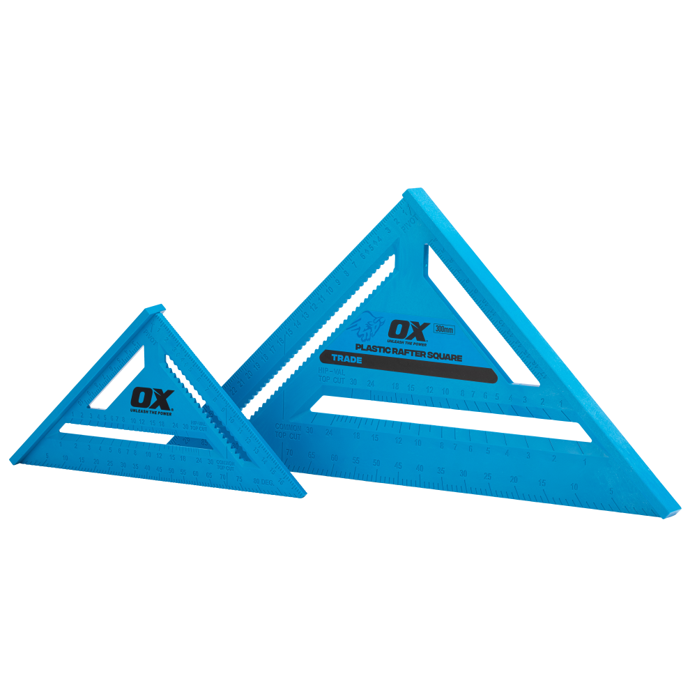 Introducing the OX Trade Plastic Rafter Square Set with two essential squares (180mm & 300mm). Precise graduations allow easy readings, while the wide base ensures a secure hold on materials and aids saw guide use. Made from heavy-duty ABS plastic, ensuring reliability and durability for any job site.